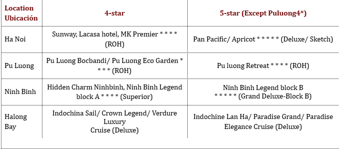 Los precios están expresados en dólares estadounidenses por persona, en base a dos huéspedes compartiendo habitación doble o twin en los hoteles mencionados. Las tarifas a continuación no son válidas para Navidad, Año Nuevo (normalmente del 20 de diciembre al 10/15 de enero), Año Nuevo chino/vietnamita, Día de la Independencia (30 de abril), Primero de Mayo, Día Nacional (2 de septiembre), etc. Para más información sobre fechas específicas, contáctenos.
