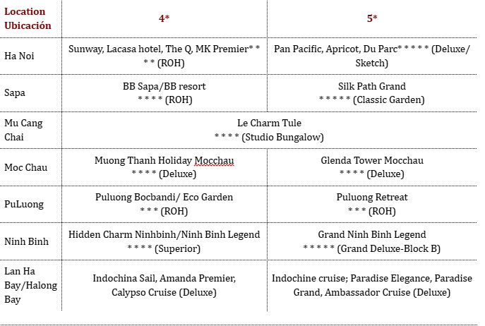 Los precios están expresados en dólares estadounidenses por persona, en base a dos huéspedes compartiendo habitación doble o twin en los hoteles mencionados. Las tarifas a continuación no son válidas para Navidad, Año Nuevo (normalmente del 20 de diciembre al 10/15 de enero), Año Nuevo chino/vietnamita, Día de la Independencia (30 de abril), Primero de Mayo, Día Nacional (2 de septiembre), etc. Para más información sobre fechas específicas, contáctenos.