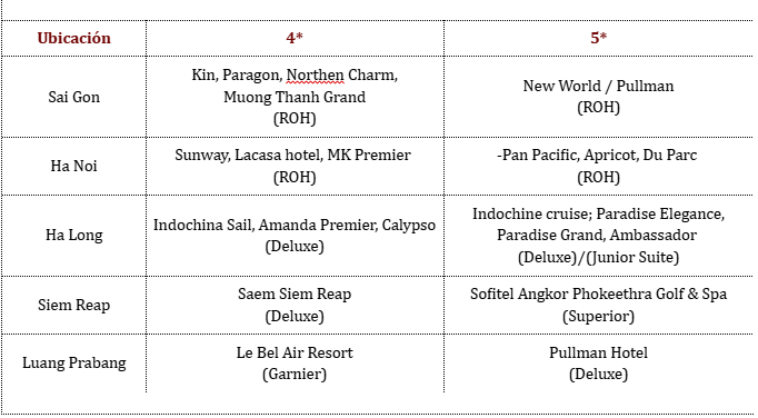 - Niño de 2 a 10 años: con cama supletoria o colchón en el crucero de Halong: 75% de la tarifa de un adulto
