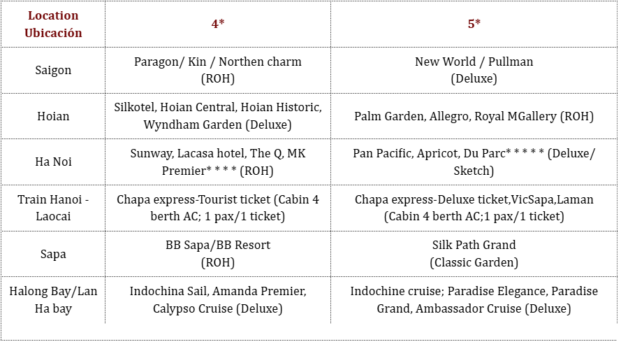 - Niño de 2 a 10 años: con cama supletoria o colchón en el crucero de Halong: 75% de la tarifa de un adulto