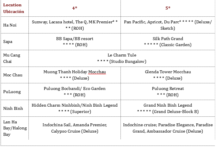 Los precios están expresados en dólares estadounidenses por persona, en base a dos huéspedes compartiendo habitación doble o twin en los hoteles mencionados. Las tarifas a continuación no son válidas para Navidad, Año Nuevo (normalmente del 20 de diciembre al 10/15 de enero), Año Nuevo chino/vietnamita, Día de la Independencia (30 de abril), Primero de Mayo, Día Nacional (2 de septiembre), etc. Para más información sobre fechas específicas, contáctenos.