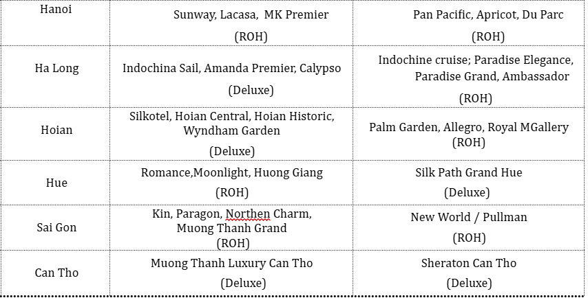 Los precios están expresados ​​en dólares estadounidenses por persona, en base a dos huéspedes compartiendo habitación doble o twin en los hoteles mencionados. Las tarifas a continuación no son válidas para Navidad, Año Nuevo (normalmente del 20 de diciembre al 10/15 de enero), Año Nuevo chino/vietnamita, Día de la Independencia (30 de abril), Primero de Mayo, Día Nacional (2 de septiembre), etc. Para más información sobre fechas específicas, contáctenos.